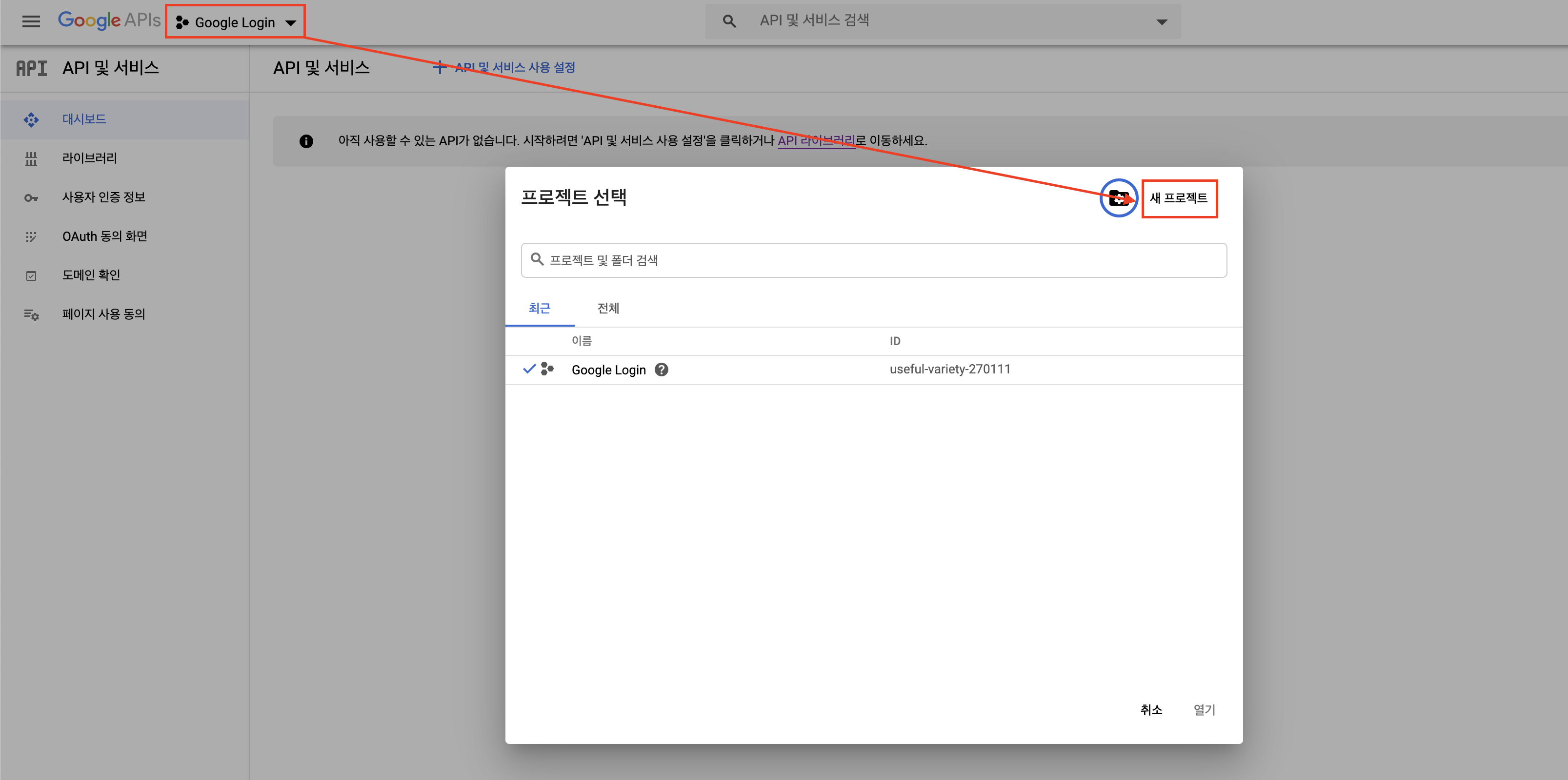 초기 화면 프로젝트 생성 프로젝트가 없으면 만들어줍니다. 저는 프로젝트 이름을 'Google Login'로 만들어준 상태이기에 밑에 프로젝트가 있지만 만든 적이 없으신분은 없으실 겁니다.